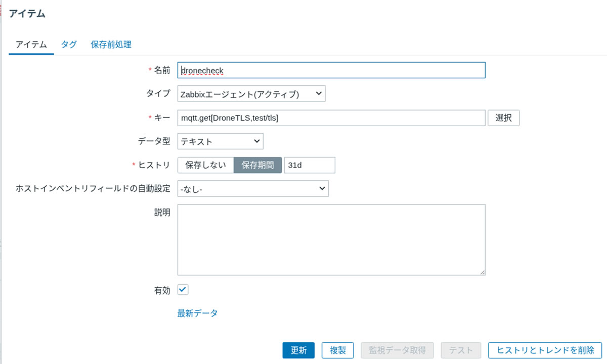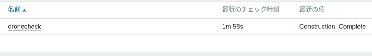 Zabbix Web 画面の[ 監視データ ] → [ 最新データ ]で、アイテム dronecheck の最新の値に Construction_Complete が表示されれば構築完了です。