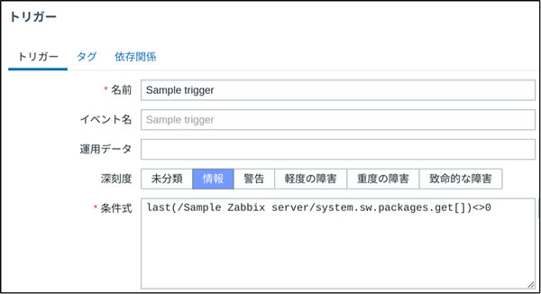 Zabbix エージェントがパッケージ情報を収集した際に発火するトリガーの設定も必要です。
