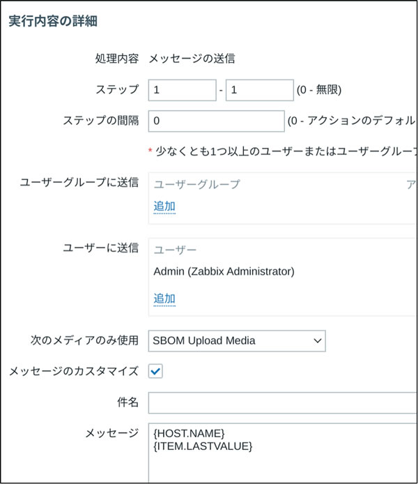 メッセージ : {HOST.NAME}{ITEM.LASTVALUE}の 2 項目を指定