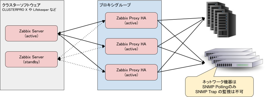 Zabbix Proxy HA は SNMP Trap 監視に対応していません。SNMP Trap 監視を行いたい場合は、Zabbix Server と同様にクラスターソフトウェアを用いた Active - Standby 型の冗長構成にする必要があります。