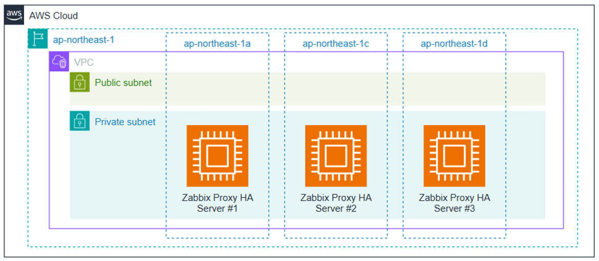 下記の図は、 AWS において VPC の Private Subnet の各 AZ に EC2 で Zabbix Proxy を 3 台構築し Zabbix Proxy HA とする構成です。仮に 1 つの AZ が停止しても、残りの AZ にある Zabbix Proxy で監視の継続が可能です。この HA 動作については、前回のブログ「構築・設定」編の後半にてご紹介しています。