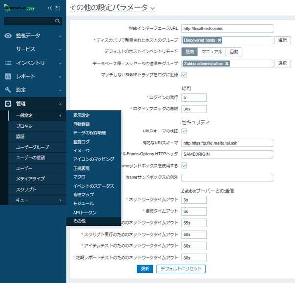 Web フロントエンドへアクセスし、「管理」->「一般設定」->「その他」を開きます。 Web インターフェース URL に http://localhost/zabbix を指定します。