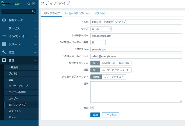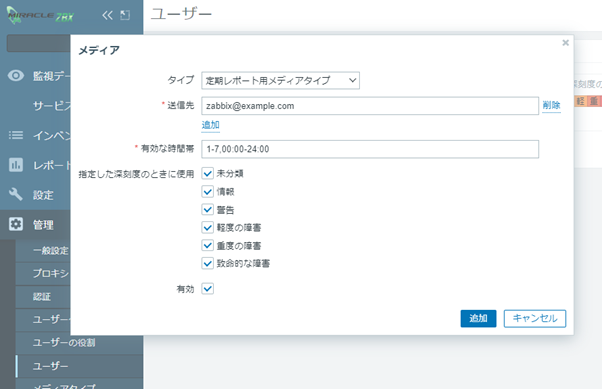 MIRACLE ZBX Web フロントエンドの「管理」->「メディアタイプ」からメディアタイプを作成します。定期レポートの配信を行うには、ユーザーに「メール」タイプのメディアを設定する必要があります。ここではメール受信に必要な設定を追加します。