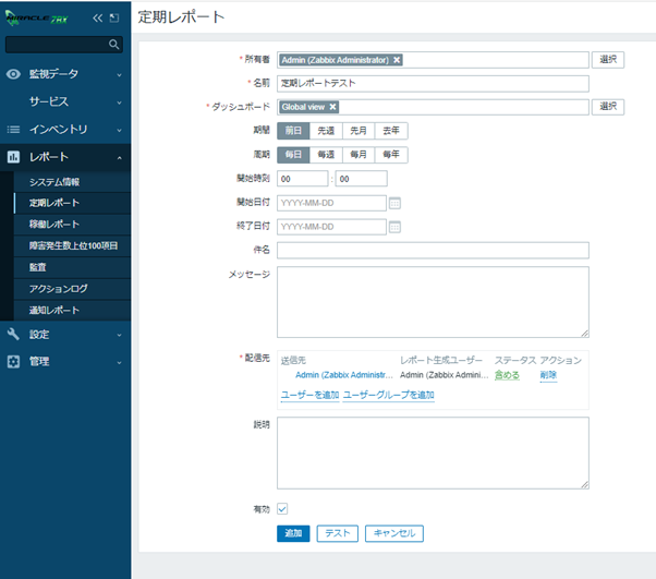 | 配信先 | Admin | レポートの受信者のリスト。 メールのメディアが設定されているユーザーまたはユーザーグループを設定できます。ユーザーグループに含まれるユーザーを追加し、ステータスを「含めない」に設定した場合メールは送信されません。ステータスが「含める」のユーザーが一人以上設定されている必要があります。 |