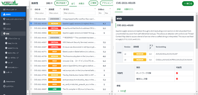 CentOS をはじめとする Linux や、 Windows などのソフトウェアと、ネットワークスイッチなどのデバイスの脆弱性を高精度でスキャンし、最新の CVE データベースと照合して各サーバーのパッチ適用状況と事前に設定したポリシーへの違反を一元管理可能にする脆弱性管理ツールです。「MIRACLE Vul Hammer」の活用により脆弱性の有無を自動的に可視化・通知可能にし、企業のソフトウェア管理業務の大幅な省力化と、脆弱性の早期発見や迅速な対応を通じてサイバー攻撃のリスク低減を支援します。