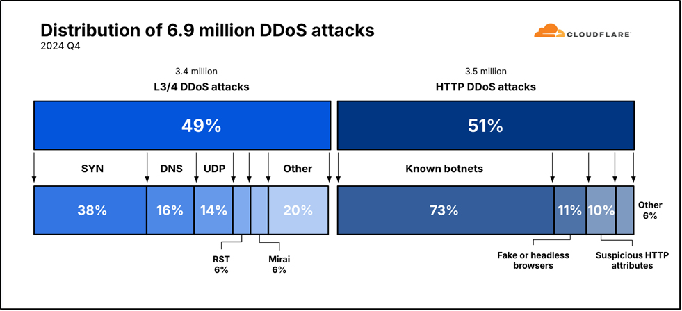 また、2024 年第 4 四半期の DDoS 攻撃のうち、49%(340 万)がレイヤー 3・レイヤー 4DDoS 攻撃で、51%(350 万)が HTTP DDoS 攻撃(下図)のうち左側(レイヤー 3・レイヤー 4DDoS 攻撃)が前述のトレンドマイクロの攻撃と重なると考えられます。