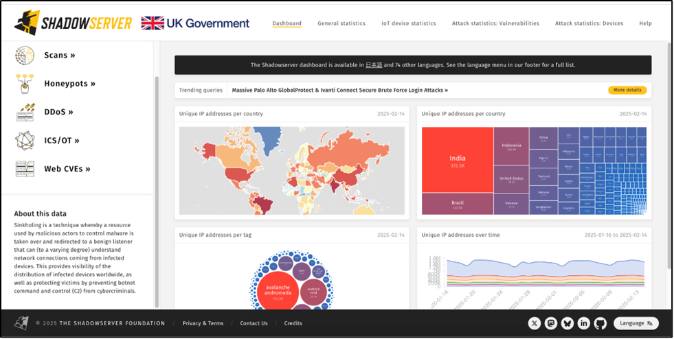 次に、ShadowServer で DDoS の状況を確認してみます。Shadowserver は The Shadowserver Foundation という有志のセキュリティ専門家によって運営されている SaaS で、英国外務/英連邦/開発省 (FCDO) などの助成金を通じて資金を調達しているものになります。