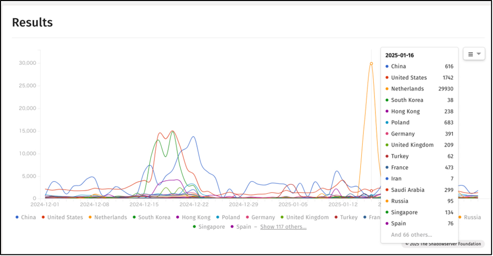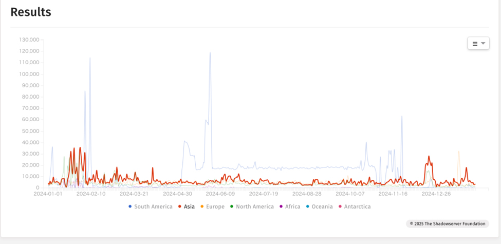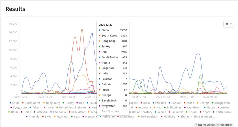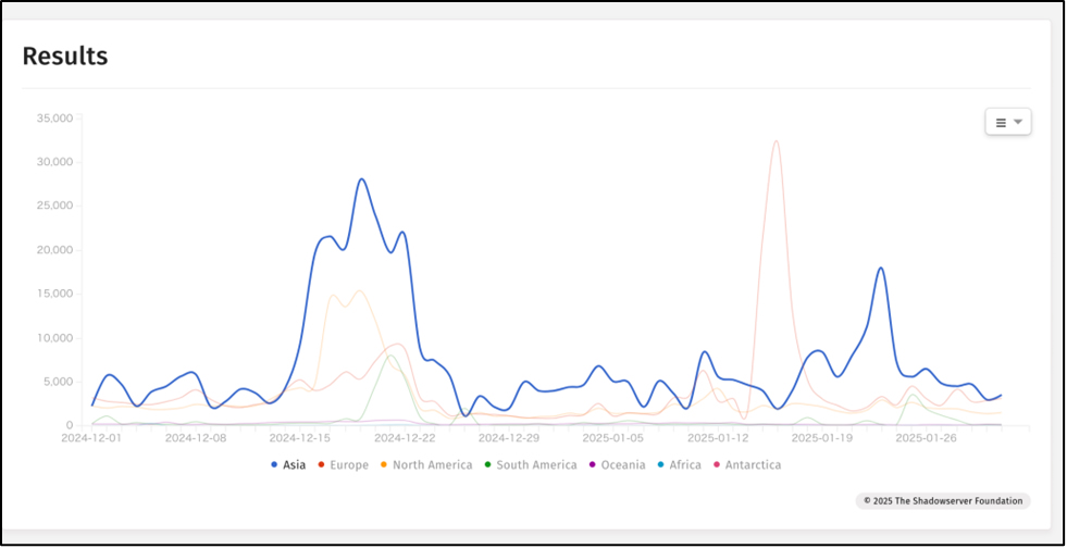 - 該当の時期の DDoS 状況を確認するために、2024/12/01-2025/01/31 までの DDoS 状況をみてみます。Asia をフォーカスしたグラフが以下になります。