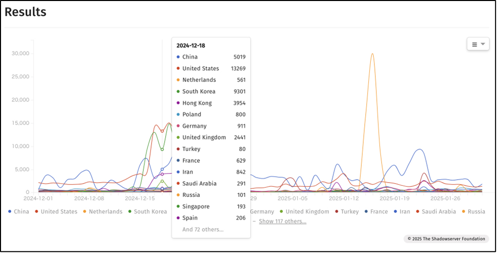 以下の情報は TrendMicro 社による 2024 年 12 月 27 日~2025 年 1 月 4 日の期間の集計になりますが、攻撃対象の IP 情報から、アジアや北米・南米・欧州と様々な地域を対象に攻撃が行われていたことがわかります。