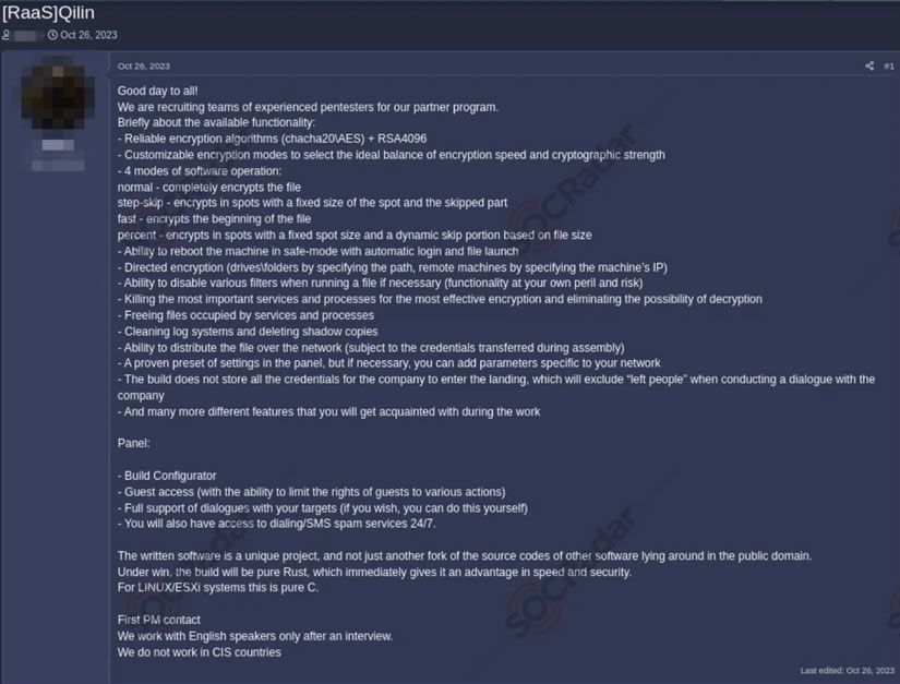 Qilin は、ロシア語圏限定のフォーラム RAMP(Ransom Anon Market Place の略)で宣伝されており、ロシア語話者が中心となっているグループと考えられています。2023 年後半には仲間を募っている様子が確認されています。