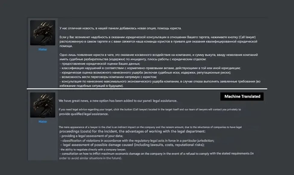 RaaS としてのサポートもしっかり行っており、2025 年 6 月には Qilin の管理者である Haise 氏が RAMP に投稿し、RaaS パネル(アフィリエイトに提供される RaaS インフラを管理するパネル)に「弁護士へ電話」という機能を追加すると発表しました。これは、アフィリエイトが恐喝交渉をうまく進めるための法的アドバイスを提供するものです。