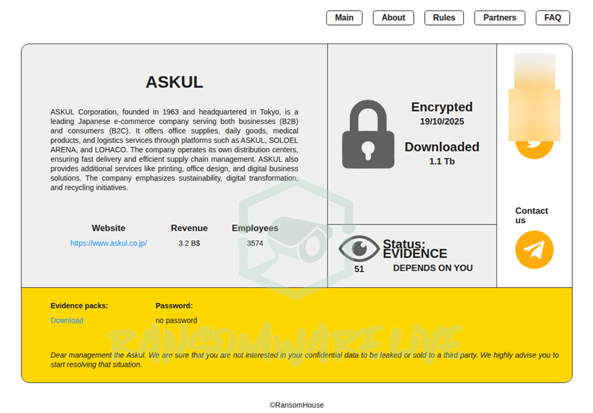 2025/10/19 に アスクル社が、同社のシステムがランサムウェア攻撃に遭い停止し、情報も流出した可能性があると報告を行いました。こちらの攻撃には 10/30 に RansomHouse という脅威アクターが犯行声明と脅迫を行っています。