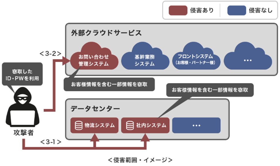 例外的に多要素認証を適用していなかった業務委託先に対して付与していた管理者アカウントの ID とパスワードの漏洩と不正利用が確認されてます。 - 検知の遅れ