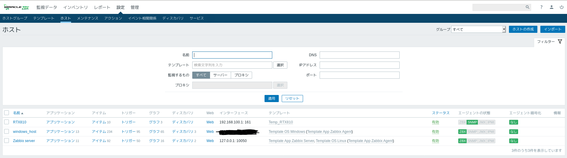 Zabbix 管理画面から、設定の項目の中にあるホストを選択します。