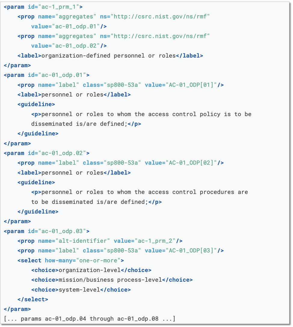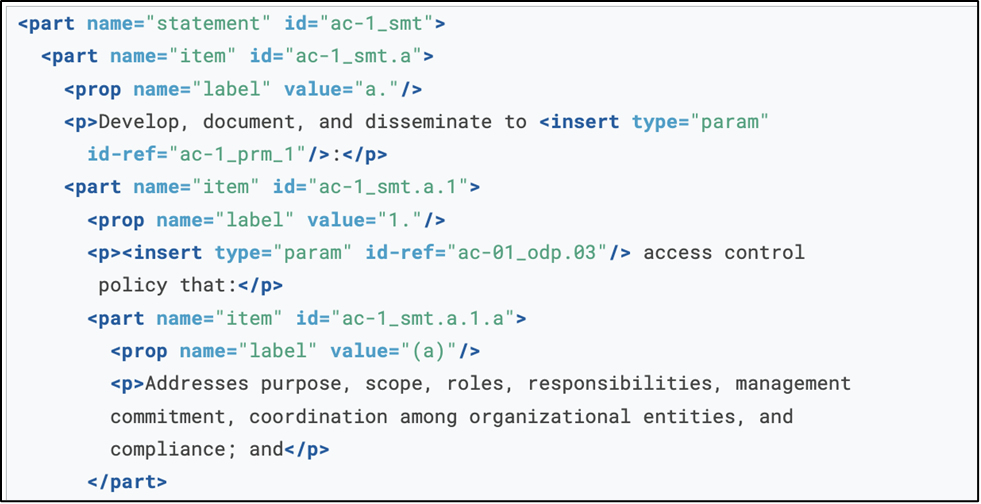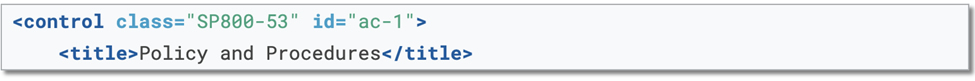 - Control にはクラス「SP800-53」が割り当てられます。コントロール ID は ac-1 で、<title> でタイトルが指定されています。
