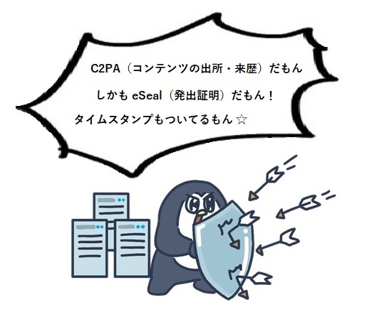 特に注目すべきは、e シールも付与した点です。e シールは、デジタルデータを発行する組織の身元を証明し、データが改ざんされていないことを確認できるようにすることでデータのトラストを確保し、信頼性を高めます。これにより、サンプルコンテンツは、C2PA 準拠の電子署名によって出所・来歴情報が保証されるだけでなく、発行元が確かにサイバートラストであることも証明されます。e シールには、弊社の iTrust e シール用証明書(JIPDEC トラステッド・サービス登録を取得)を使用しました。また、タイムスタンプには弊社から提供のアマノタイムスタンプ(総務大臣認定を取得)を使用しています。