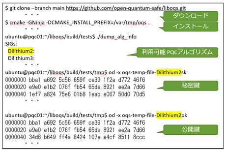 試しに PQC ライブラリ liboqs ですが、Github(open-quantum-safe/liboqs)[12] の "Quickstart" の記載に従ってソースを get し、build して、liboqs がサポートしている暗号アルゴリズム一覧を見たり、例えば格子暗号 DILITHIUM(「ダイリチウム」と呼ぶそうです)の鍵ペアの作成を試してみたり、なども簡単に試すことができます。