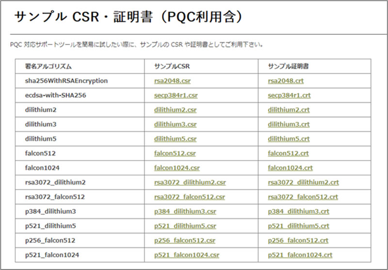 併せて、簡易にサポートツールがお試しできるよう、サンプルの CSR や証明書も同ページに用意しました。