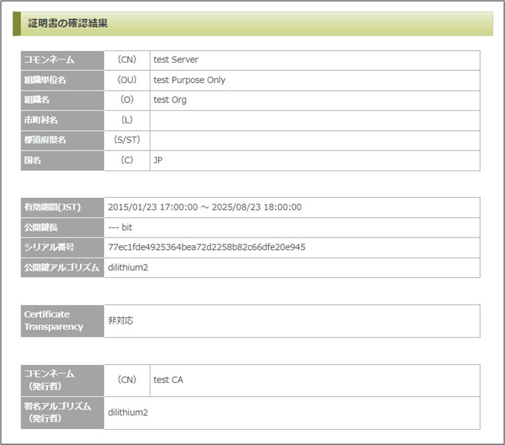 サポートツールの「サーバー証明書の内容確認」のページにペーストして「確認」ボタンを押すと、以下のような結果が得られ、署名アルゴリズムとして dilithium2 が利用されていることなどが確認できます。