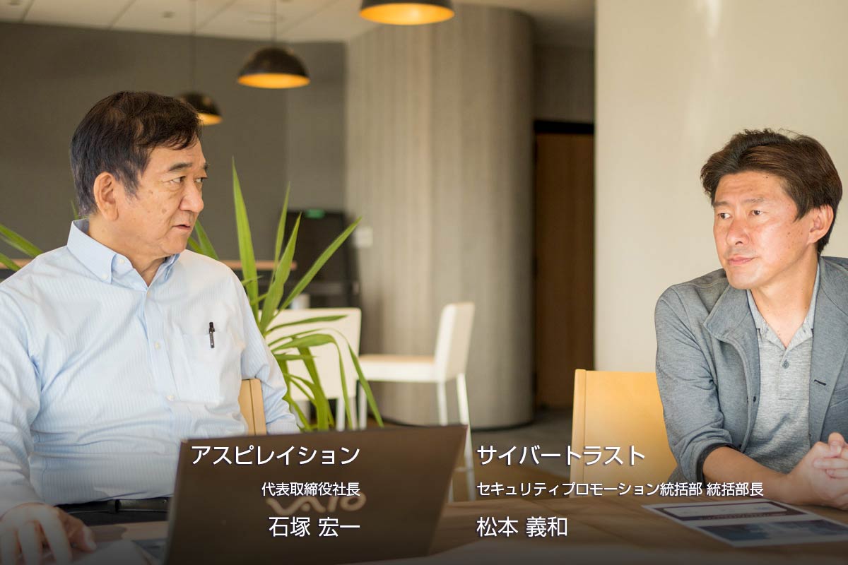 サイバートラストの情報セキュリティコンサルタントである松本氏とアスピレイションの石塚氏が、IT デューデリジェンスについての課題を話し合いました。