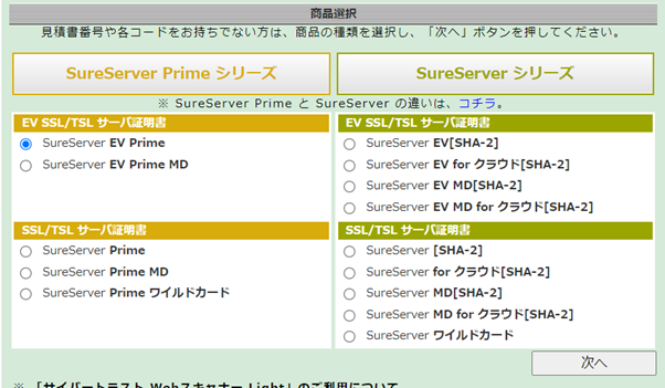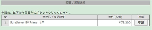 商品の選択画面が表示されます。 iTrust SSL/TLS サーバー証明書 Primeシリーズから商材を選択しましょう。iTrust SSL/TLS サーバー証明書シリーズは旧シリーズとなるため価格やライセンス体系が異なります (金額もiTrust SSL/TLS サーバー証明書 Primeの方がお求めやすくなっています)