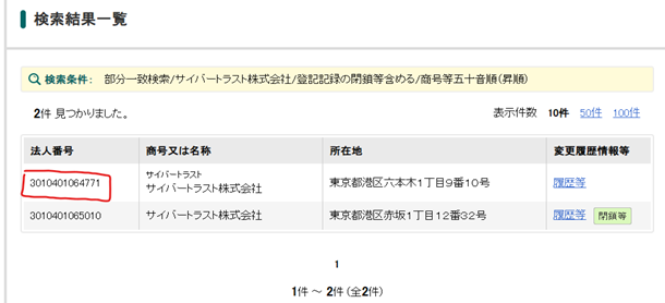 表示された法人番号から先頭の1桁を除いたものが会社法人等番号になります。