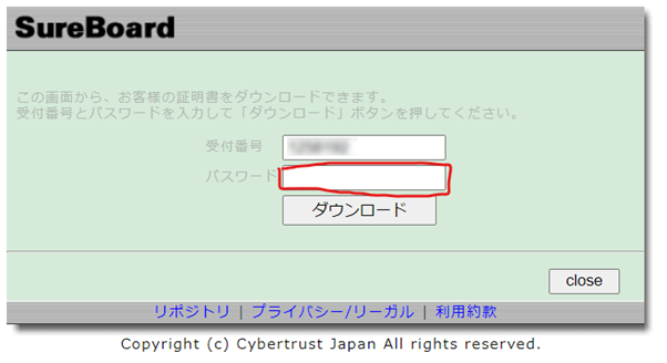 メールに記載されている証明書のダウンロード用 URL にアクセスして、証明書のダウンロード画面に進みます。インストール用パスワードを入力してSSL/TLS サーバー証明書をダウンロードしましょう。