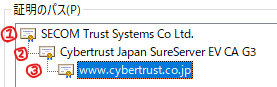 図の ① にあたるのがルート証明書で ② は中間CA証明書、③ が SSL/TLS サーバー証明書です。