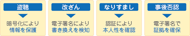 電子証明書を用いると4大リスクを次のように防ぐことができます。