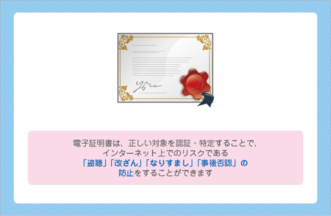 電子証明書とは、対象を正しく認証・特定するインターネットにおける身分証明書です。