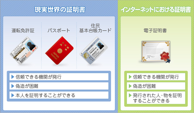 電子証明書は、現実の世界における運転免許証やパスポートのように対象を正しく認証・特定する、インターネットにおける身分証明書です。