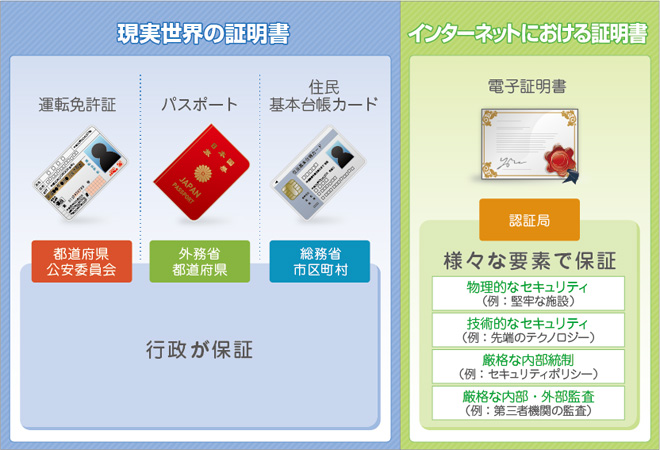 パスポートをはじめとする現実の世界の証明書は、信頼できる機関(=行政)が、偽造されにくい仕組みで、正しく本人に向けて発行しています。