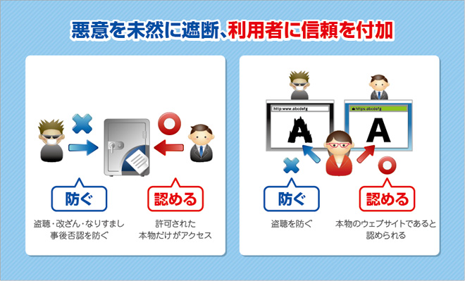 証明書が登録されているウェブサイトは通信を暗号化できるので、盗聴されても漏洩を防ぐことができます。また、銀行などで利用されている上位の証明書では、サイトが「本物である」ことを証明できるので、フィッシングサイトと見分けることができます。