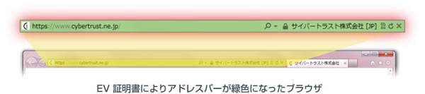 EV だけが特別に組織の実在が認証されたことをブラウザ上でわかりやすく表現されます。ブラウザによって細かな表現方法は異なりますが、例えば Internet Explorer の場合、EV であればアドレスバーが緑色になります。また、主要なブラウザでは、証明書の名義人(Web サイトの運営者)の名前が表示されます。