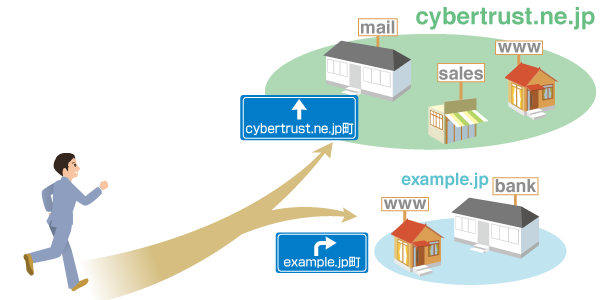 では、当社を例に説明しますと、サイバートラストは、cybertrust.ne.jp というドメインを持っており、当社のホームページ用に www という名のサーバーを使用しています。 この www という名のサーバーに cybertrust.ne.jp を付け加えて、www.cybertrust.ne.jp をホームページの住所としています。