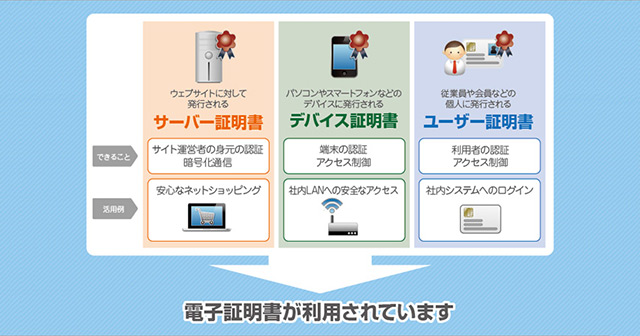 サイバートラスト社に代表される信頼された認証局が、情報通信先のサーバーのサイト運営組織が実在していることを証明し、Web ブラウザと Web サーバー間(サーバー同士でも可能)で SSL(Secure Socket Layer)/ TLS (Transport Layer Security) 暗号化通信を行うための電子証明書です。SSL/TLS 証明書には以下の2つの機能があります。