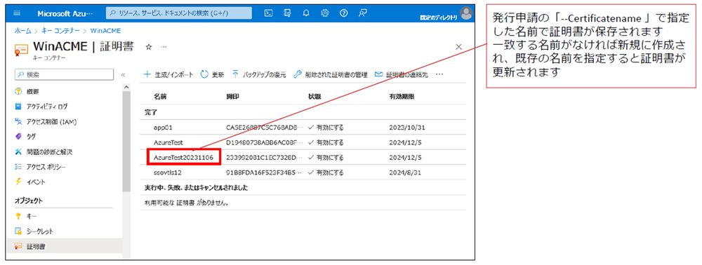 IIS および Azure 環境におけるサーバー証明書更新を自動化する場合は、ACME クライアント「win-acme」が動作する環境を介して、取得したサーバー証明書と秘密鍵をアップロードすることができます。