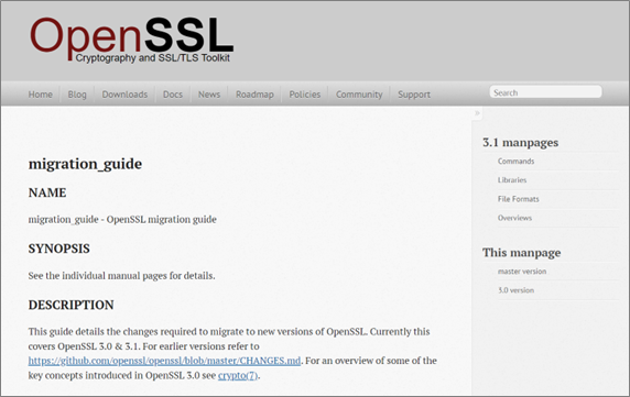 OpenSSL Project では、OpenSSL 移行ガイドを提供しています。このガイドでは、OpenSSL の新しいバージョンに移行するために必要な事項が解説されています。