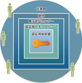 お客様の重要な資産である認証局の鍵、データ、システムを物理的に完全にガードします。 認証局の運用に必要となる業務に合わせてセキュリティ区画を設け、その区画毎にオペレータに対し入室権限を与えます。 認証局セキュアルームは複数名でないと入室できず、かつ、生体認証が要求される、非常に高度な管理体制となっています。 -