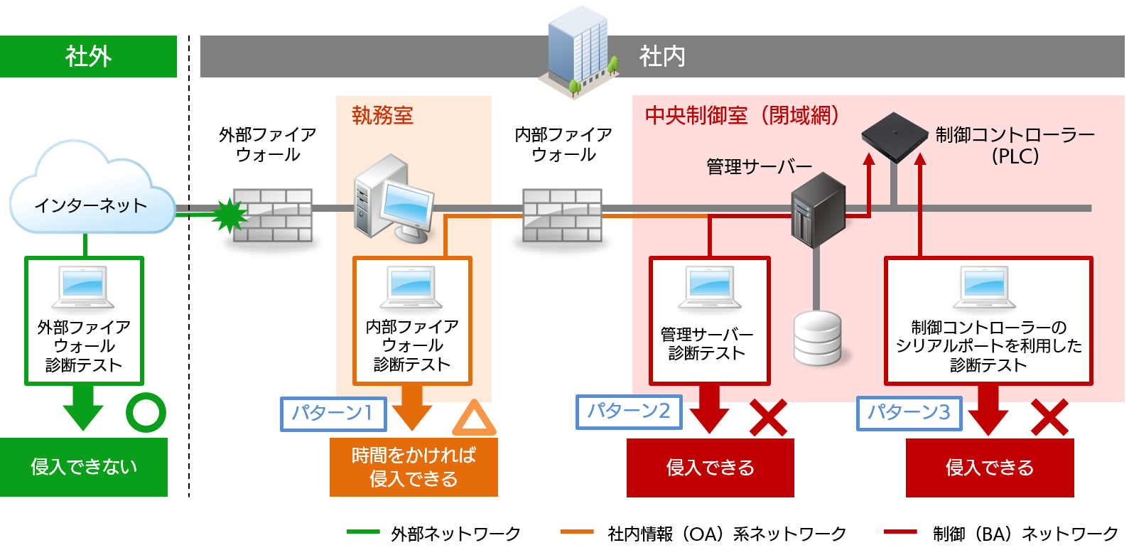 まずパターン 1 では、「執務室」を想定したビル内の一般的なオフィスフロアから、建屋設備をコントロールしている中央制御室への侵入を試みました。執務室の構内ネットワーク網から、中央制御室を保護している FireWall(NAT ルーター)を攻撃して、管理サーバーにアクセスできるか検証しました。