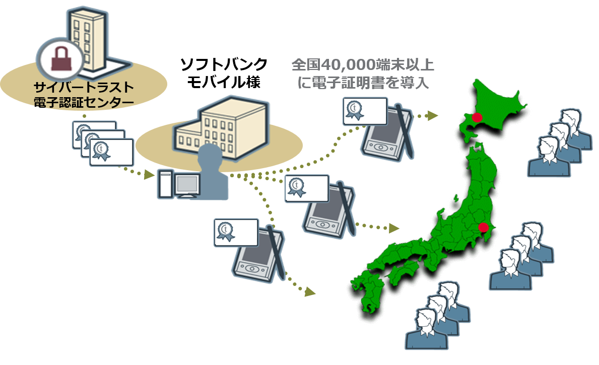 ソフトバンクモバイルでは、「サイバートラスト マネージド PKI」の導入により、申込業務を電子化するにあたり、厳格な端末認証、およびデータの暗号化等によるセキュリティの向上を短期間に実現すると共に、申込業務の効率化を同時に実現しました。