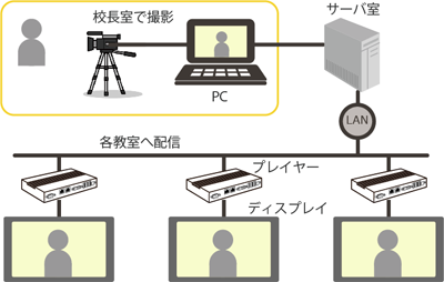 ライブ放送については、当初はマルチキャストでライブストリーミングを行うことを考えていましたが、エンコーダーなどの必要機材を揃えるには大きなコスト負担が障害となっていました。模索した結果、Flash サーバを用いることで当初の構想に近いライブ配信ができることが分かり、オープンソースの “red5” を利用して念願の機能を構築しました。導入後初のライブ放送は、山本久信前学校長が約 5 分間の訓辞を各クラスに配信し、福岡県内でも初の試みとなるライブ放送が実現しました。校長室にビデオカメラと映像配信用のパソコンを設置し、動画データをサーバ室に送り、サーバ室から各教室のプレイヤーを経由してディスプレイに配信する仕組みです。