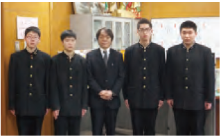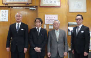 写真左から、山本前校長、福來(ふくらい)先生、同窓会 坂田事務局長、大野教頭