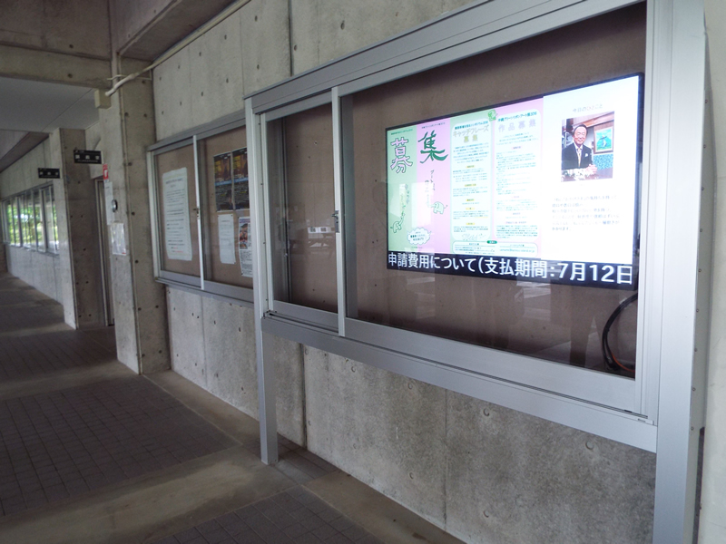 デジタルサイネージの運用実績が評価され、SAKURAUM 以外に 4 ヶ所増設し、休講・補講情報などをタイムリーに発信しています。
