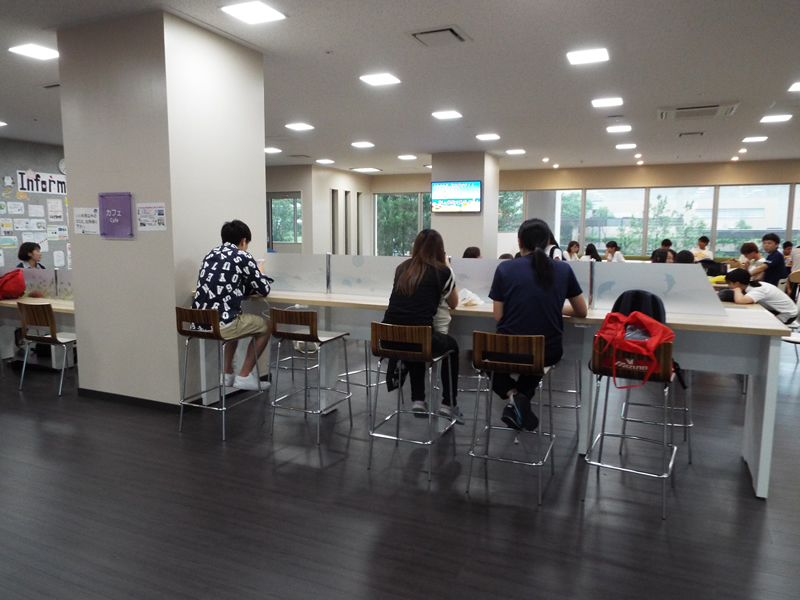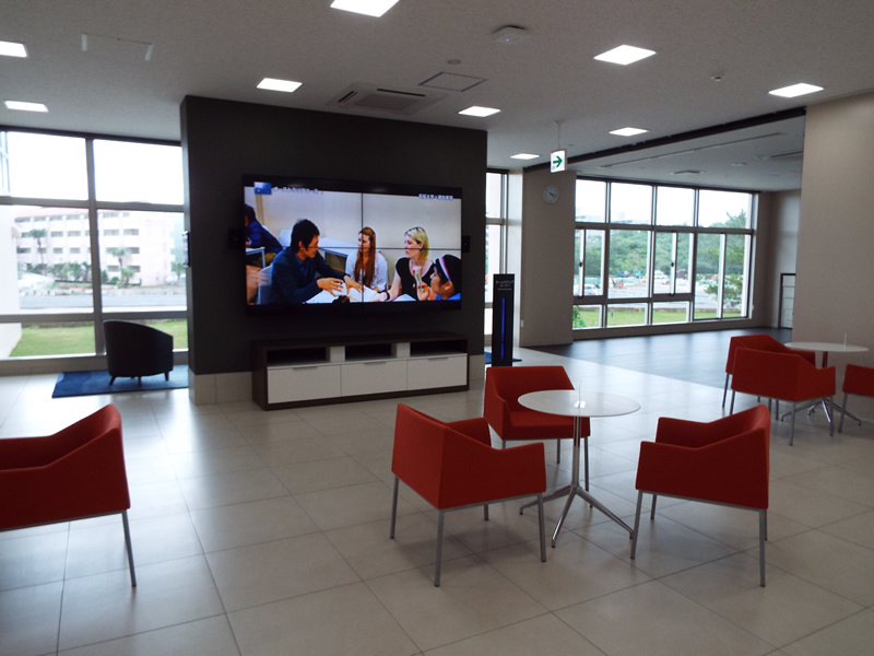 名桜大学では、地域貢献の一つとして、図書館や SAKURAUM 内のカフェテリアなど、学内の一部を一般開放しており、コースによっては一般の方も受講可能にしています。「デジタルサイネージで情報提供することで、一般利用可能な施設情報が周知され、学生以外の来訪者にもメリットと感じていただいているのではないでしょうか。」( 玉城氏 )
