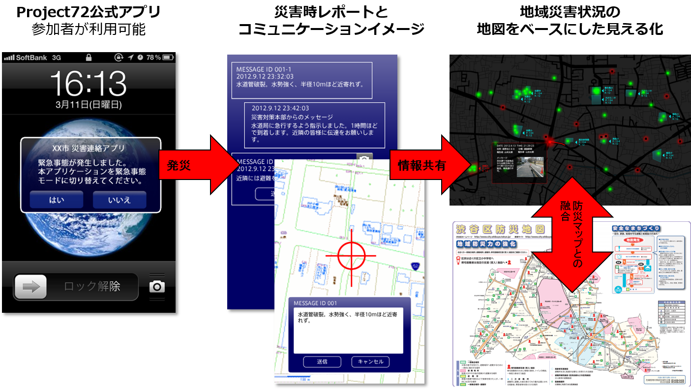 スマートフォンの Project 72 公式アプリにより、位置情報がリアルタイムにサーバーにアップされます。このデータを整理することにより、どのような経路を通って避難所に戻ってきたかを可視化することができます。