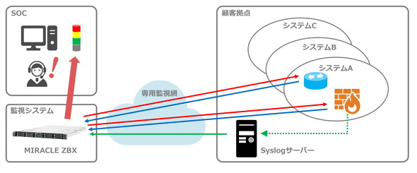 ファイアウォールなどのセキュリティ機器については、顧客の拠点に設置してある Syslog サーバにログをいったん保管し、そこから MIRACLE ZBX8400 にログを送信している。もし何らかの異常を検知すれば、MIRACLE ZBX8400 がパトランプを光らせて監視員に知らせることができる。