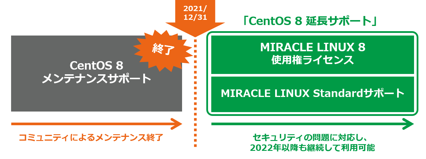 CentOS 8 を導入予定のお客様には、情報系、基幹系、組込み特殊機器にも採用実績のある Red Hat Enterprise Linux クローンの「MIRACLE LINUX 8 Asianux Inside」への移行を支援します。本サービスのご利用により、コミュニティや外資企業の影響を受けず、国産 Linux を長期にわたってご利用可能になります。