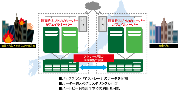 地震、洪水、火災、停電などの災害時も HA クラスターで業務を継続させることができます。