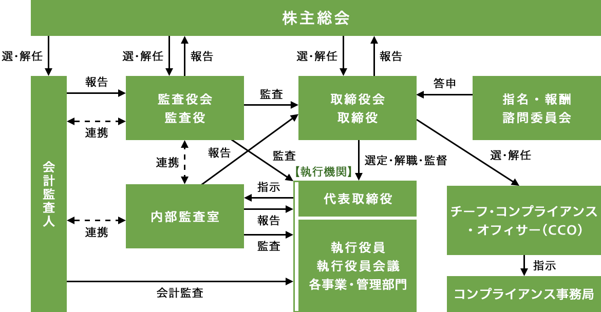 当社は会社法に基づき取締役会及び監査役会を設置するとともに、経営に関する機能を分担して、意思決定権限と責任の明確化及び業務執行の迅速化を図るため執行役員制度を採用しており、現行の経営体制は、取締役7名、執行役員12名(うち取締役兼務者2名)、監査役3名であります。また、取締役のうち社外取締役は3名、監査役のうち社外監査役は2名であり、それぞれ独立した視点から経営監視を行っております。当社がこのような体制を採用している理由は、効率的な経営・執行体制の確立を図るためには、独立社外監査役を含めた監査役による監査体制が経営監視機能として有効であり、また経営環境の変化や新たな事業領域への進出に対して迅速かつ的確な意思決定を行い、それとともに業務執行の監督機能と取締役会における相互牽制機能強化を両立していくために、当社業務に精通した社外取締役を活用し、経営監視機能を補完することで経営の公正性・透明性及び効率性が高まるものと判断しているためです。